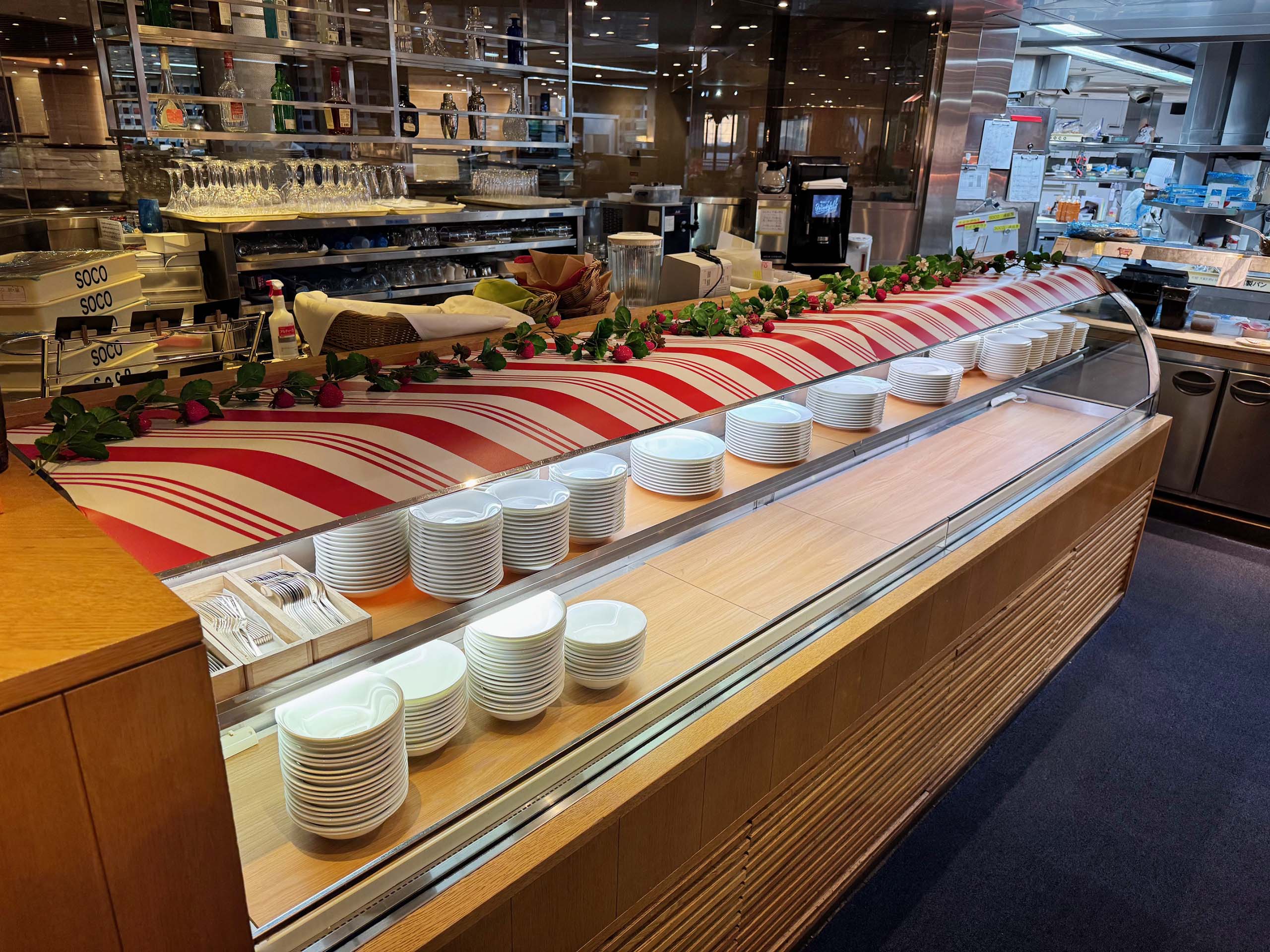 ピクニックをイメージしたバスケットやブッフェ台の天面にシートを貼って空間を演出しています。